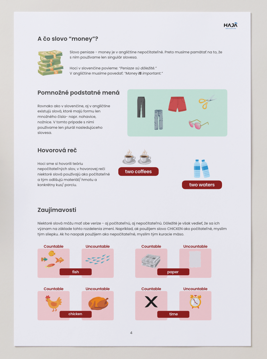 • Cvičenia sú drillovacie, aby si si zapamätal rozdelenie a použitie počítateľných a nepočítateľných podstatných mien